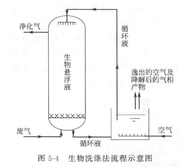 2. Biological washing method Biological washing method, also known as biological absorption method, is suitable for treating soluble organic waste gas. The biological washing system generally consists of a washing tank and a bioreactor (regeneration tank) with activated sludge, as shown in Figures 5-4. The biological washing method has low pressure loss, small equipment volume, and can simultaneously contain organic waste gas with dust content. The disadvantage is that the treatment efficiency of insoluble components in exhaust gas is very low.