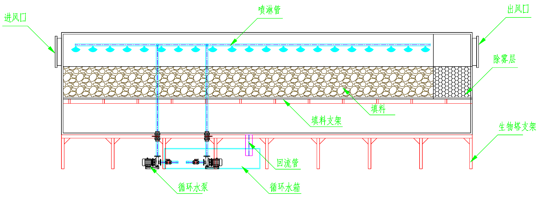 Biological drip filtration is a biological treatment technology that falls between biological filtration and biological washing, and is the most commonly used form of biological treatment. He mainly consists of a biological bed, a humidification system, and a dosing system<